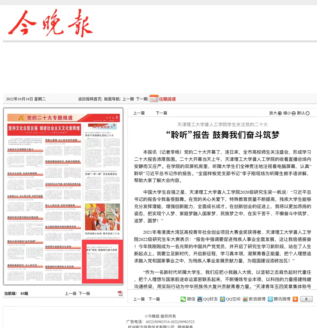 10月18日,《今晚報》第3版報道我校聾人工學(xué)院學(xué)生關(guān)注中國共產(chǎn)黨第二十次全國代表大會情況,內(nèi)容如下: