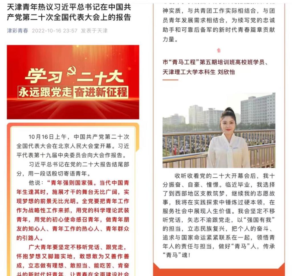 10月16日,津彩青春報道市“青馬工程”第五期培訓班高校班學員、我校語言文化學院本科生劉欣怡熱議黨的二十大報告情況,內容如下: