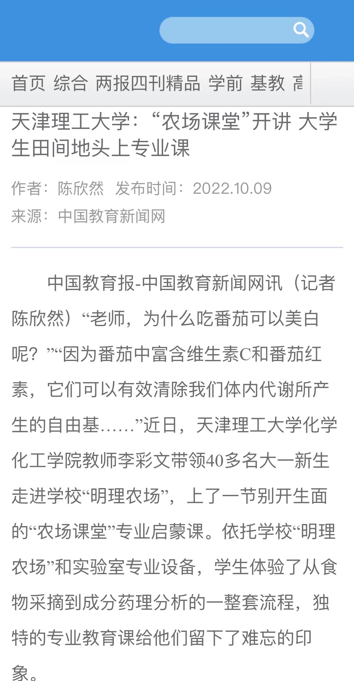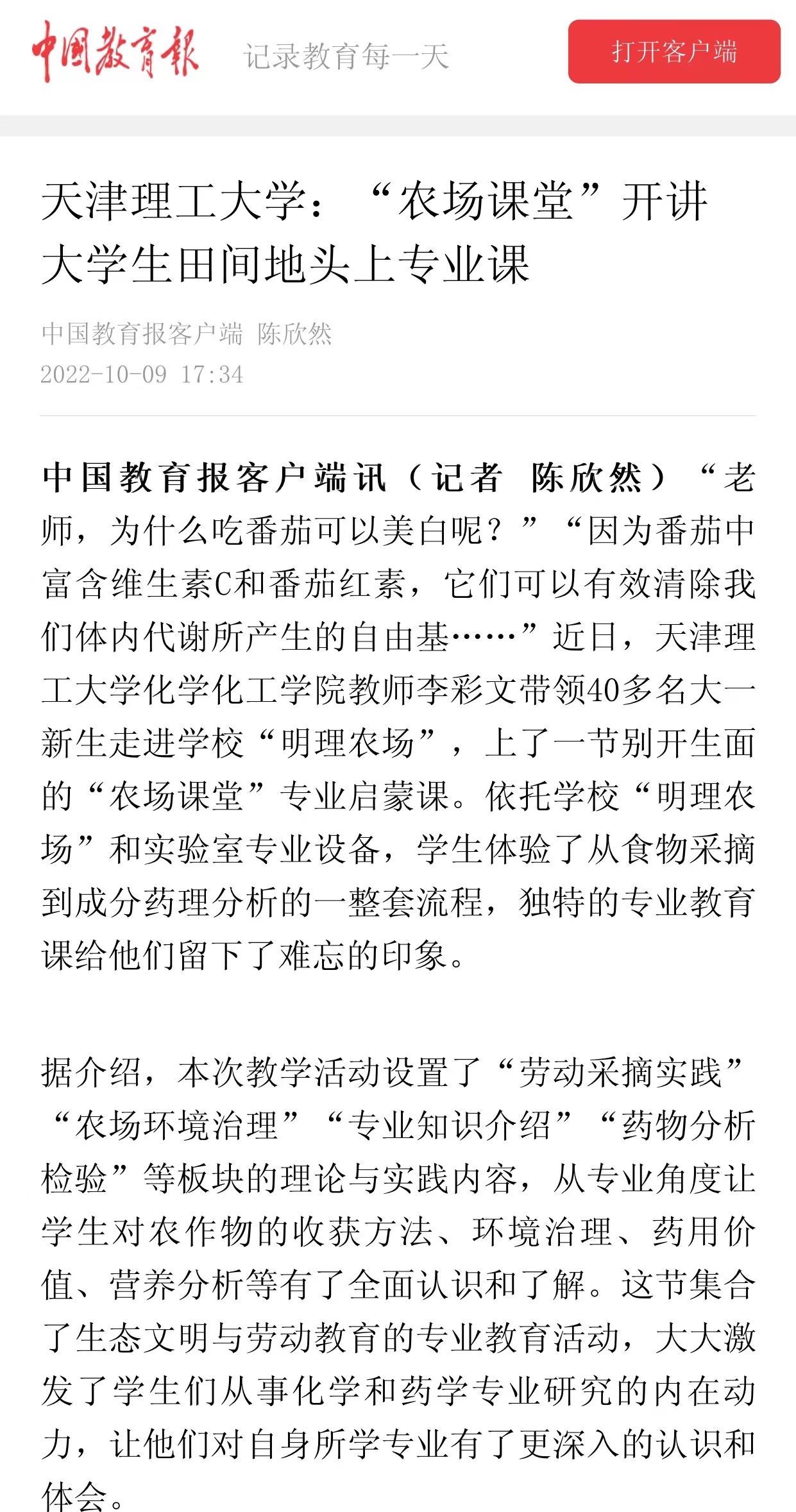 “老師,為什么吃番茄可以美白呢?”“因?yàn)榉阎懈缓S生素C和番茄紅素,它們可以有效清除我們體內(nèi)代謝所產(chǎn)生的自由基……”近日,天津理工大學(xué)化學(xué)化工學(xué)院教師李彩文帶領(lǐng)40多名大一新生走進(jìn)學(xué)校“明理農(nóng)場(chǎng)”,上了一節(jié)別開生面的“農(nóng)場(chǎng)課堂”專業(yè)啟蒙課。依托學(xué)校“明理農(nóng)場(chǎng)”和實(shí)驗(yàn)室專業(yè)設(shè)備,學(xué)生體驗(yàn)了從食物采摘到成分藥理分析的一整套流程,獨(dú)特的專業(yè)教育課給他們留下了難忘的印象。