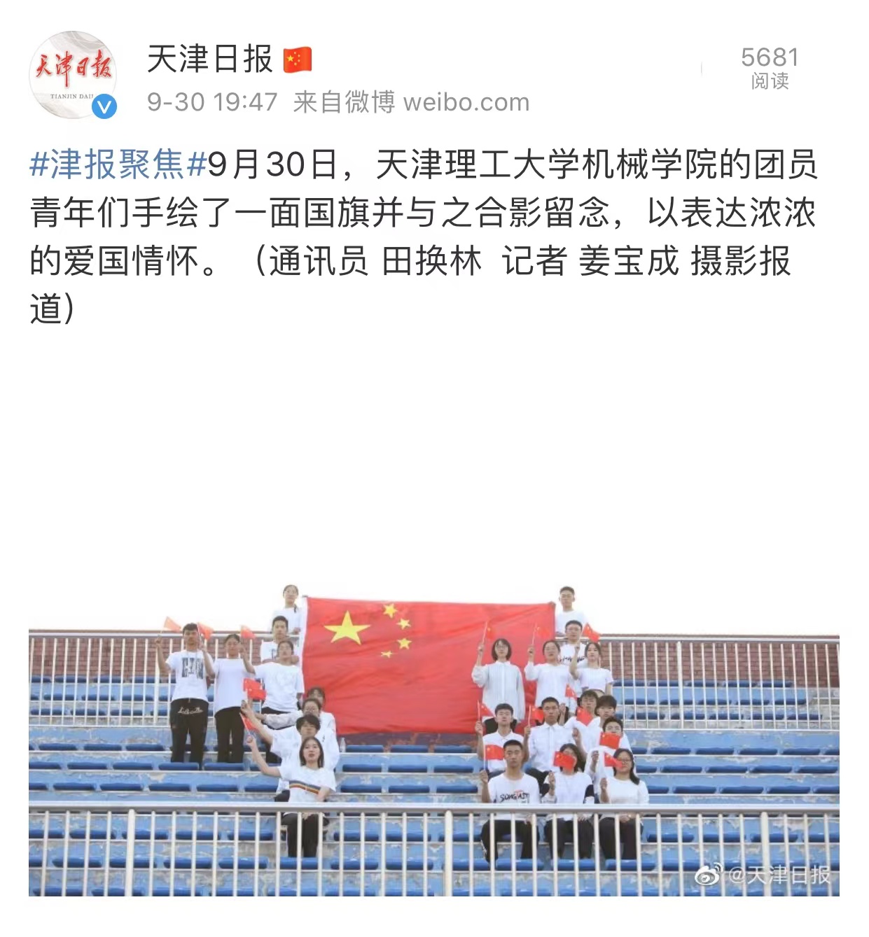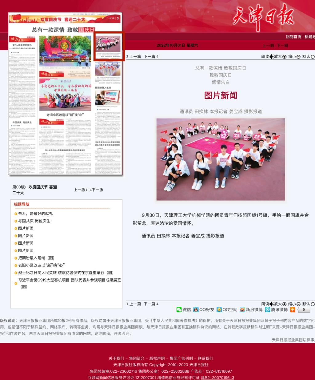 10月1日,《天津日?qǐng)?bào)》在第3版圖片新聞報(bào)道機(jī)械工程學(xué)院的團(tuán)員青年們按照國(guó)標(biāo)1號(hào)旗,手繪一面國(guó)旗并合影留念,表達(dá)濃濃的愛國(guó)情懷,內(nèi)容如下: