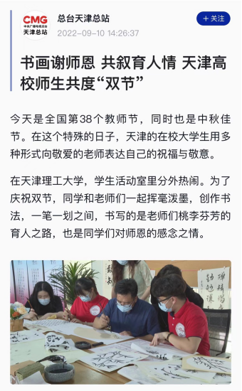 9月10日,是全國第38個教師節,同時也是中秋佳節,央視新聞總臺天津總站報道我校師生通過多種形式慶祝雙節的情況,內容如下: