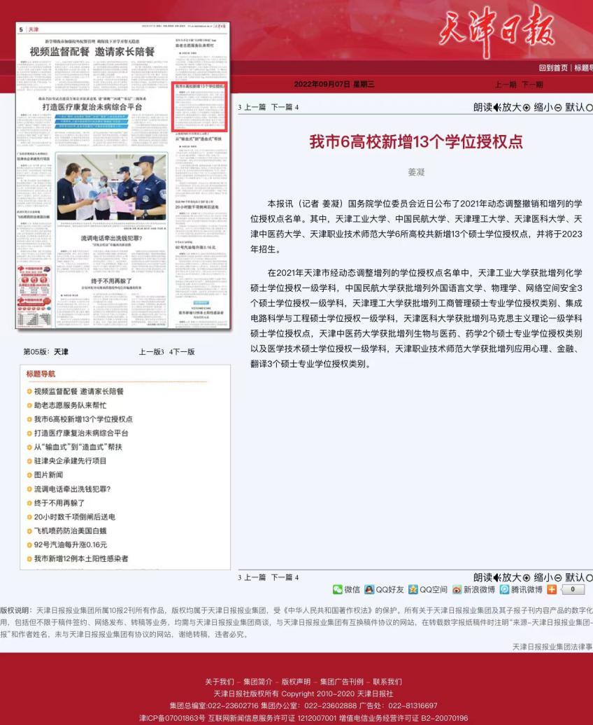 9月7日,《天津日報》在第5版報道經(jīng)國務院學位委員會批準,我校動態(tài)調(diào)整增列工商管理碩士專業(yè)學位授權類別、集成電路科學與工程碩士學位授權一級學科情況,內(nèi)容如下: