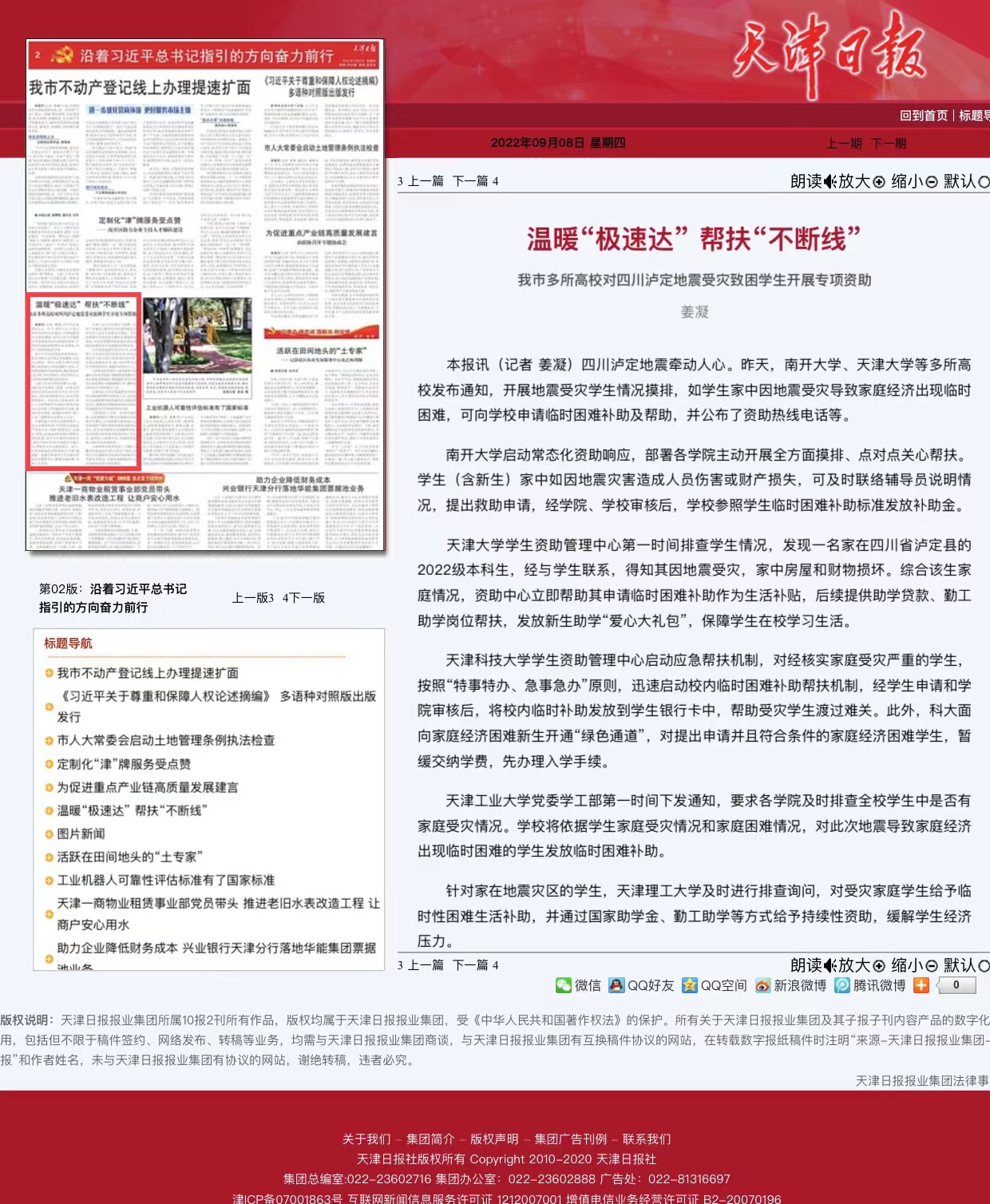 9月8日,《天津日報》在第2版報道我校對四川瀘定地震受災致困學生開展專項資助的情況,內容如下: