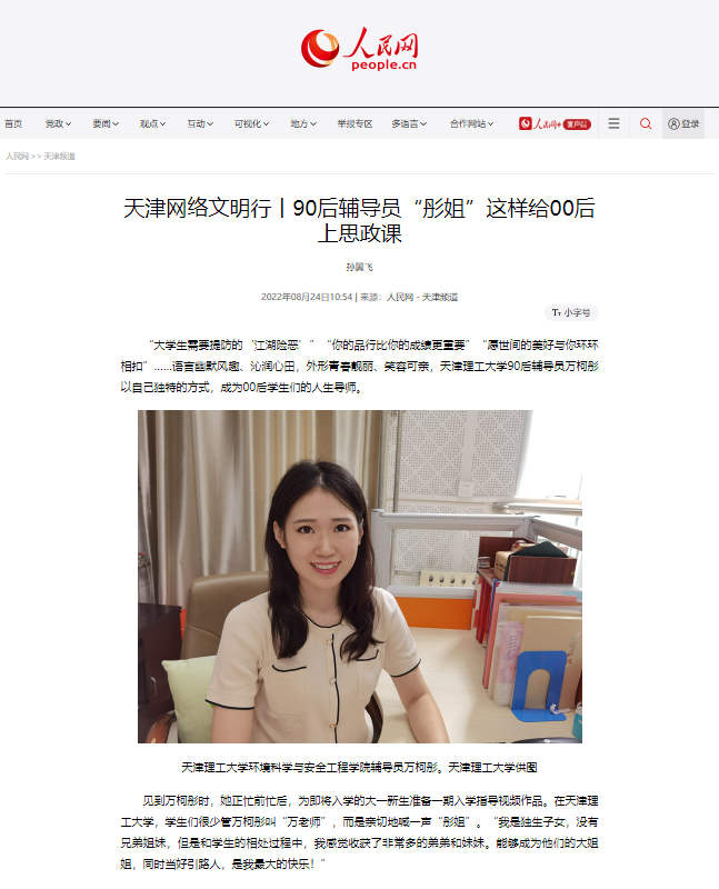 “大學生需要提防的‘江湖險惡’”“你的品行比你的成績更重要”“愿世間的美好與你環環相扣”……語言幽默風趣、沁潤心田,外形青春靚麗、笑容可親,天津理工大學90后輔導員萬柯彤以自己獨特的方式,成為00后學生們的人生導師。