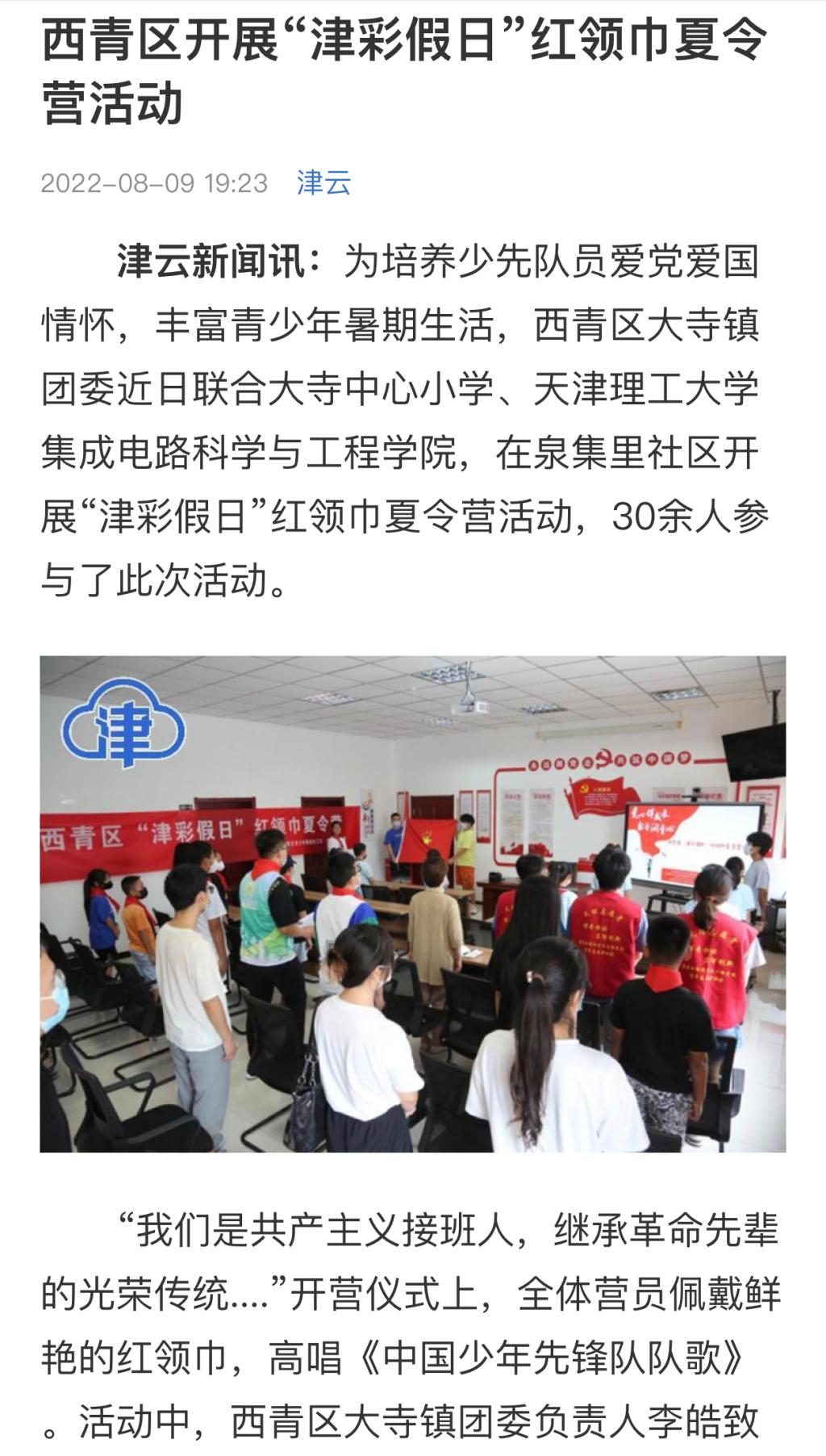 日前,津云客戶端報道我校集成電路科學與工程學院聯合西青區大寺鎮團委、大寺中心小學在泉集里社區開展“津彩假日”紅領巾夏令營活動,培養少先隊員愛黨愛國情懷,豐富青少年暑期生活,內容如下: