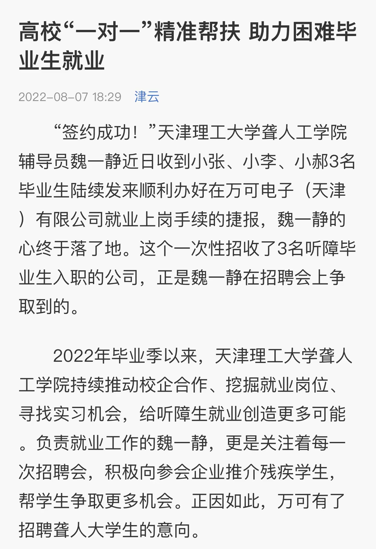“簽約成功!”近日,收到小張、小李、小郝3名畢業(yè)生陸續(xù)發(fā)來的捷報──已順利辦好在萬可電子(天津)有限公司就業(yè)上崗手續(xù),天津理工大學(xué)聾人工學(xué)院輔導(dǎo)員魏一靜的心終于落了地。這個一次性招收了3名聽障畢業(yè)生入職的機(jī)會,是魏一靜在招聘會上爭取到的。