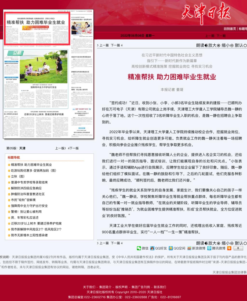 日前,《天津日報》、津云以“精準(zhǔn)幫扶 助力困難畢業(yè)生就業(yè)”為題,報道我校聾人工學(xué)院創(chuàng)新模式精準(zhǔn)施策,持續(xù)推動校企合作,挖掘就業(yè)崗位,尋找實習(xí)機(jī)會,給聽障生就業(yè)創(chuàng)造更多可能的經(jīng)驗做法,內(nèi)容如下: