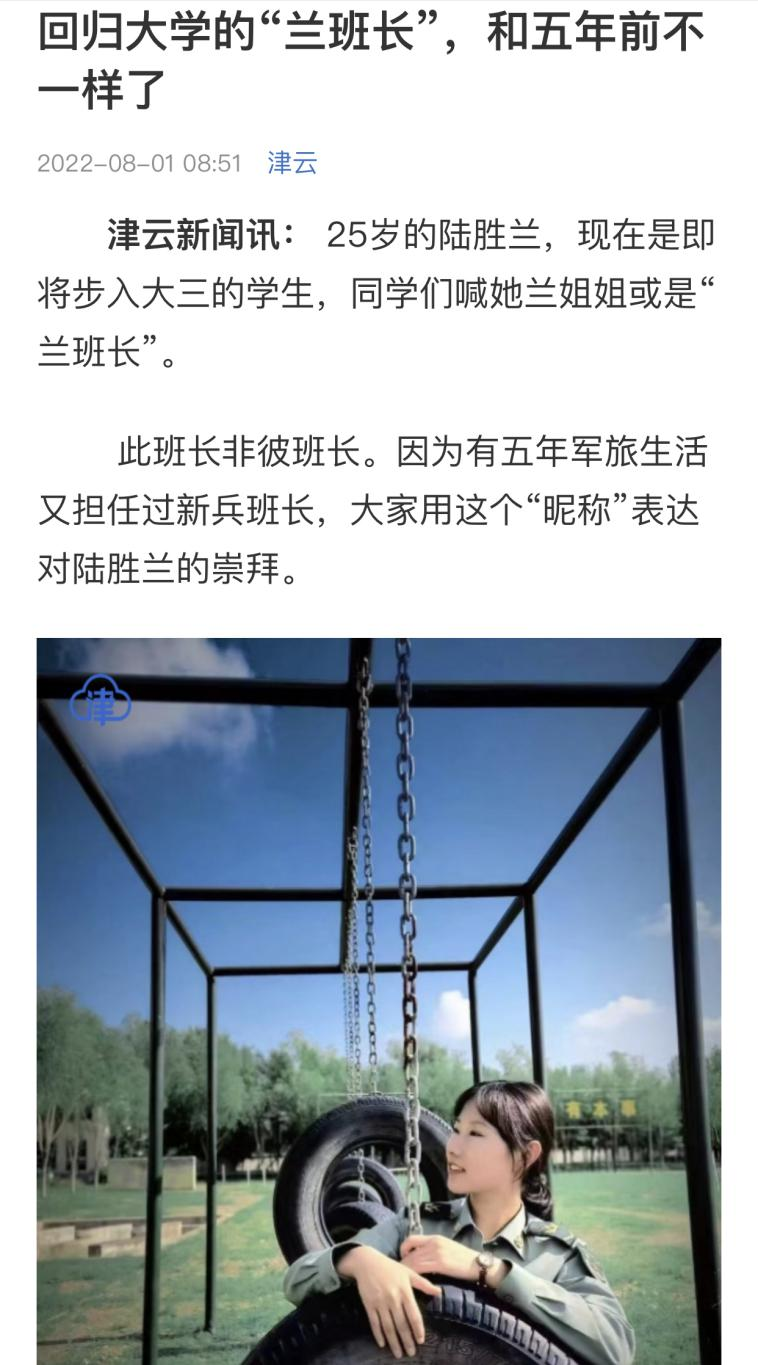 從部隊退役回歸大學校園后,總有人問陸勝蘭:當兵苦不苦、累不累?后悔不?重來一次還會不會這樣選擇?她就笑答:“如果后悔的話,我怎么會申請延長到五年呢?五年的兵我都沒當夠!”
