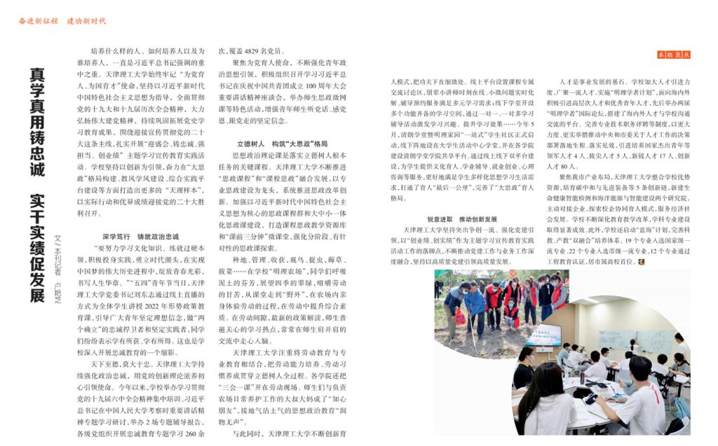 培養什么樣的人、如何培養人以及為誰培養人,一直是習近平總書記強調的重中之重。天津理工大學始終牢記“為黨育人、為國育才”使命,堅持以習近平新時代中國特色社會主義思想為指導,全面貫徹黨的十九大和十九屆歷次全會精神,大力弘揚偉大建黨精神,持續鞏固拓展黨史學習教育成果,圍繞迎接宣傳貫徹黨的二十大這條主線,扎實開展“迎盛會、鑄忠誠、強擔當、創業績”主題學習宣傳教育實踐活 動。學校堅持以創新為引領,奮力在“大思政”格局構建、教風學風建設、綜合實踐平臺建設等方面打造出更多的“天理樣本”, 以實際行動和優異成績迎接黨的二十大勝利召開。