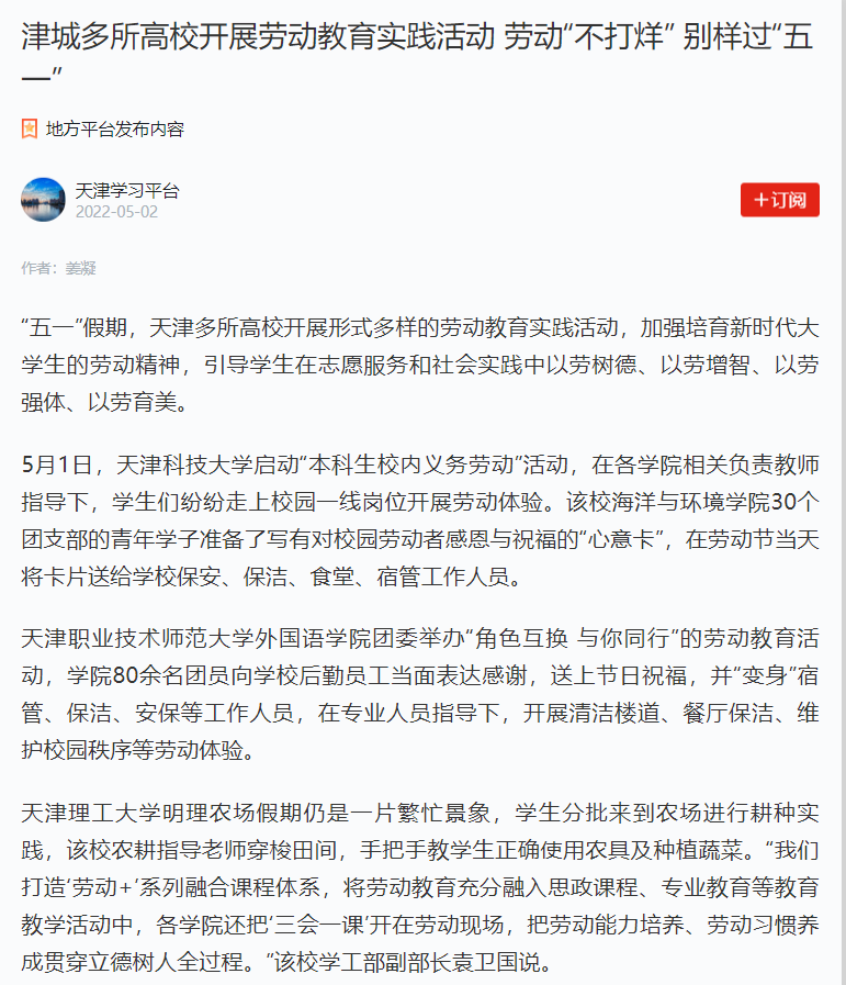 “五一”假期,天津多所高校開展形式多樣的勞動教育實(shí)踐活動,加強(qiáng)培育新時(shí)代大學(xué)生的勞動精神,引導(dǎo)學(xué)生在志愿服務(wù)和社會實(shí)踐中以勞樹德、以勞增智、以勞強(qiáng)體、以勞育美。