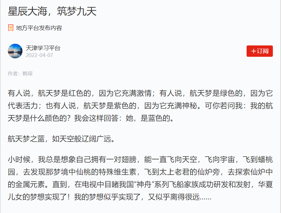 “長風(fēng)破浪會(huì)有時(shí),直掛云帆濟(jì)滄海。”李白的這兩句詩蒼勁有力,不免勾起我對大海的向往。航天事業(yè)的發(fā)展離不開航海事業(yè)的發(fā)展和支持,而華夏兒女對大海探索的腳步也從未停息。從對廢棄航母“瓦良格”號的收購到我國科技人員的改進(jìn)研發(fā),到“遼寧號”最終成功入列,從“遠(yuǎn)望一號”對航天遠(yuǎn)洋數(shù)據(jù)的測量,到“探秘遠(yuǎn)”系列測控船對航天事業(yè)的測控。中國的航海人經(jīng)過了許多艱難險(xiǎn)阻,在背后默默地為航空航天事業(yè)作出自己的貢獻(xiàn)。我堅(jiān)信,我們的努力會(huì)讓這個(gè)藍(lán)色夢想的隊(duì)伍不斷壯大,讓“夢之船”不僅能在蔚藍(lán)大海上遠(yuǎn)航,未來更能在浩瀚星空中遨游!在星辰大海中,筑夢九天。