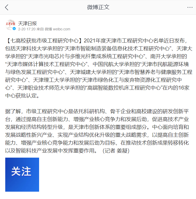 2021年度天津市工程研究中心名單近日發布,包括南開大學承擔的“天津市媒體計算技術工程研究中心”、天津大學承擔的“天津市光電芯片與多維光纖集成系統工程研究中心”、天津理工大學承擔的“天津市綠色化工與廢棄物資源化工程研究中心”、天津科技大學承擔的“天津市智能制造裝備信息化技術工程研究中心”、中國民航大學承擔的“天津市民航能源環境與綠色發展工程研究中心”、天津城建大學承擔的“天津市智慧養老與健康服務工程研究中心”、天津職業技術師范大學承擔的“高端智能數控機床工程研究中心”在內的16家中心獲批認定。