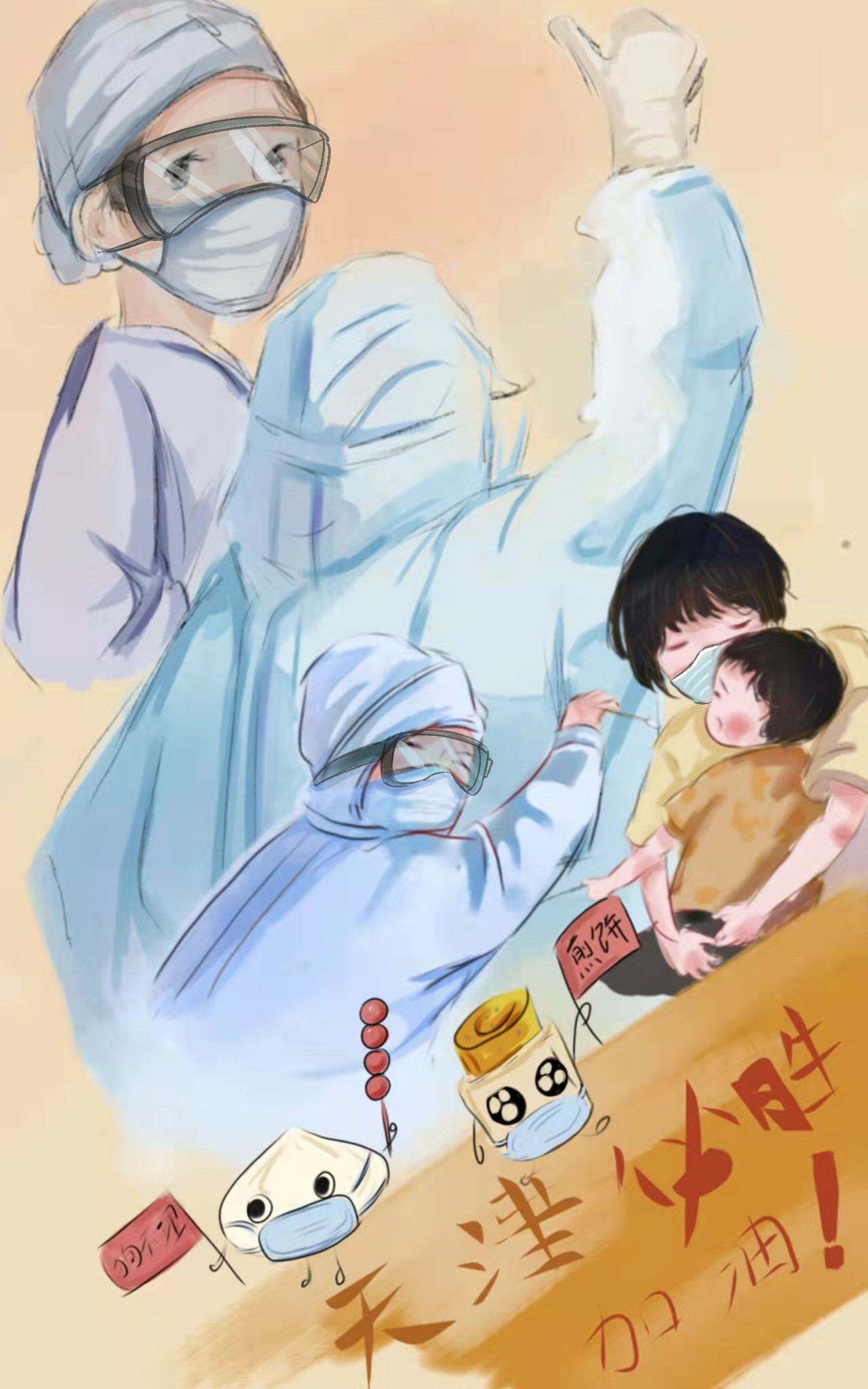作品描繪了醫(yī)護(hù)人員和志愿者的形象,他們用細(xì)致和耐心化解市民內(nèi)心的焦慮不安,右下角描繪了天津特色美食,共同為津城加油,希望我們的城市早日恢復(fù)以往的繁華喧鬧。