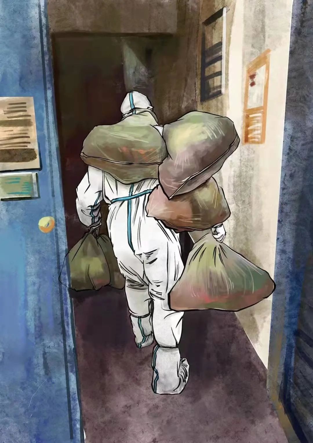 作品描繪了一名社區(qū)工作者肩扛手提許多生活物資,挨家挨戶地分發(fā)給正在隔離的居民,一個(gè)負(fù)重前行的背影,也是千萬(wàn)個(gè)社區(qū)工作者的形象縮影,正是他們?nèi)找菇惶娴母冻觯艙Q回了城市的健康活力。