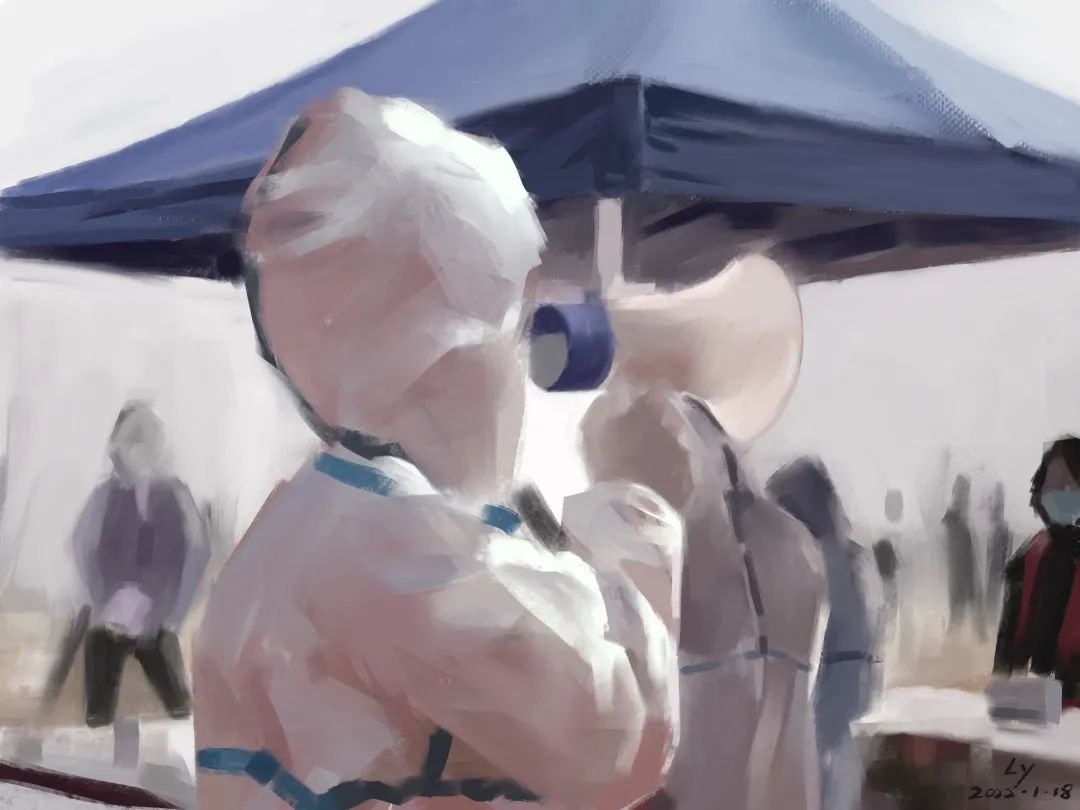 作品描繪了一名志愿者手拿喇叭,指揮著全員核酸檢測(cè)工作的有序開(kāi)展,畫(huà)雖無(wú)聲似有聲,我們仿佛能聽(tīng)到喇叭里傳遞出的聲音,為戰(zhàn)“疫”工作加油打氣,為前線戰(zhàn)士吶喊助威。