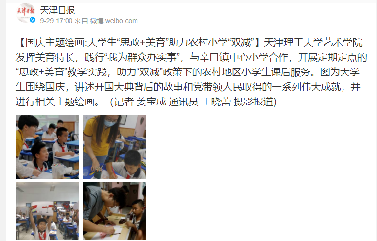 天津理工大學藝術學院發揮美育特長,踐行“我為群眾辦實事”,與辛口鎮中心小學合作,開展定期定點的“思政+美育”教學實踐,助力“雙減”政策下的農村地區小學生課后服務。圖為大學生圍繞國慶,講述開國大典背后的故事和黨帶領人民取得的一系列偉大成就,并進行相關主題繪畫。
