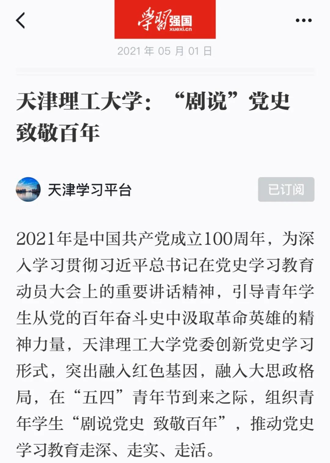 為深入學(xué)習(xí)貫徹習(xí)近平總書(shū)記在黨史學(xué)習(xí)教育動(dòng)員大會(huì)上的重要講話精神,引導(dǎo)青年學(xué)生從黨的百年奮斗史中汲取革命英雄的精神力量,天津理工大學(xué)黨委創(chuàng)新黨史學(xué)習(xí)形式,突出融入紅色基因,融入大思政格局,在“五四”青年節(jié)到來(lái)之際,組織青年學(xué)生“劇說(shuō)黨史 致敬百年”,推動(dòng)黨史學(xué)習(xí)教育走深、走實(shí)、走活。《學(xué)習(xí)強(qiáng)國(guó)》刊發(fā)了活動(dòng)情況,全文如下: