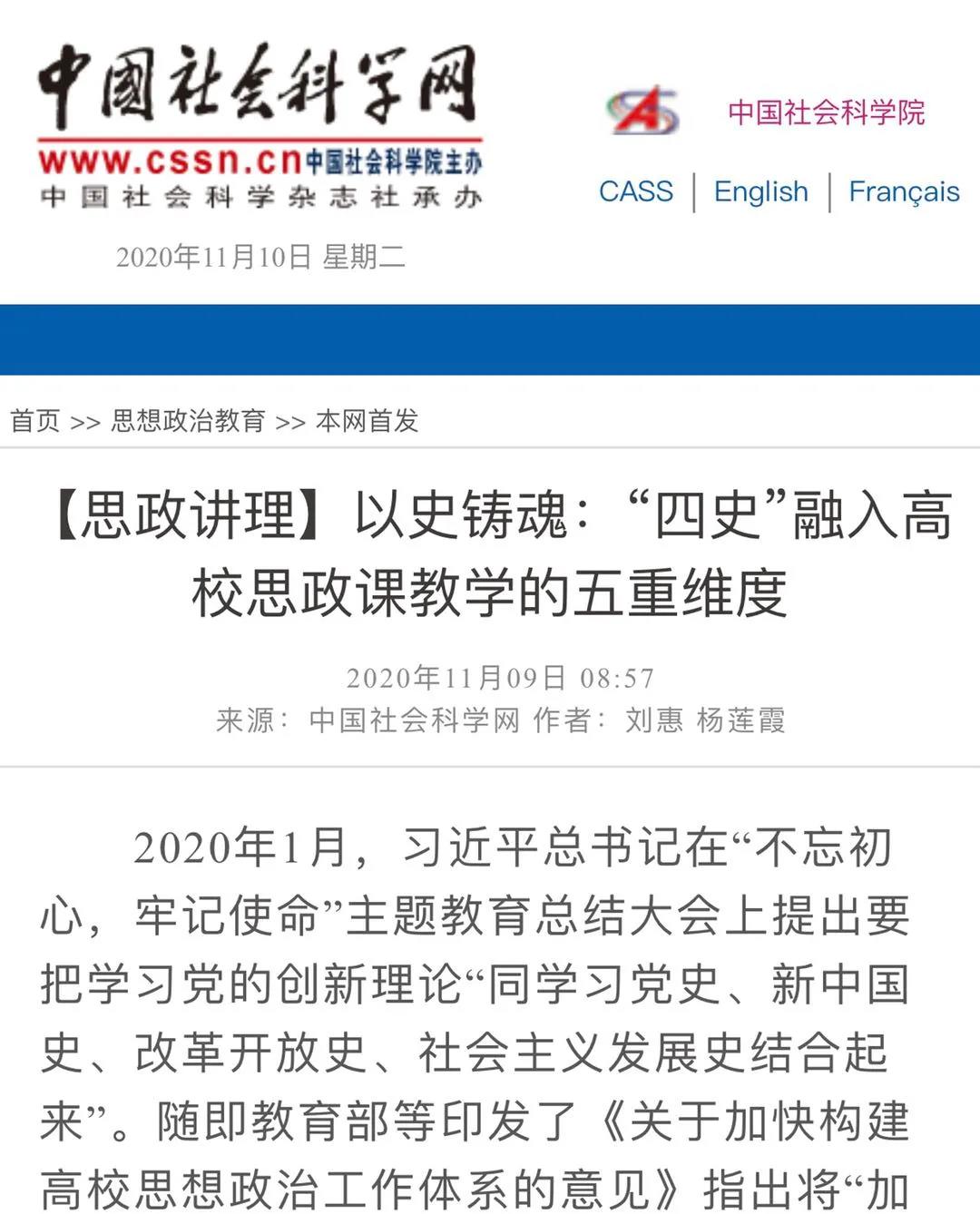 11月9日,《中國社會科學網》思想政治教育專欄刊發了我校馬克思主義學院劉惠、楊蓮霞老師撰寫的《以史鑄魂:“四史”融入高校思政課教學的五重維度》理論文章。