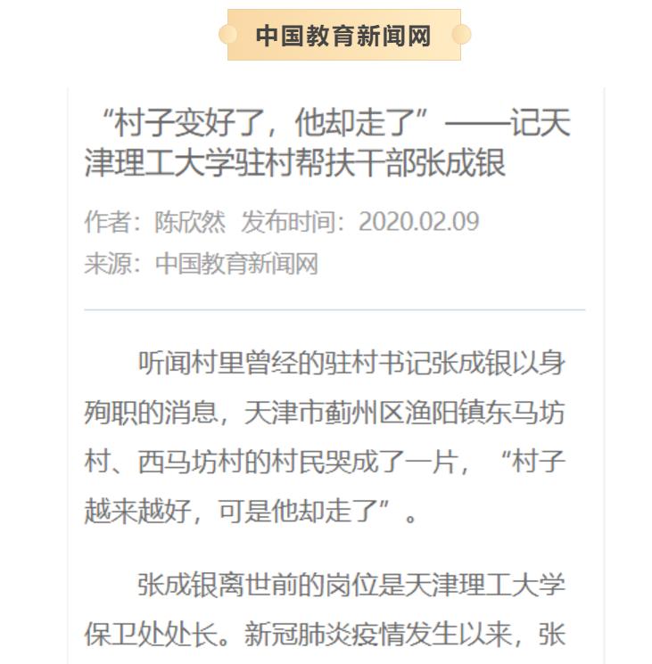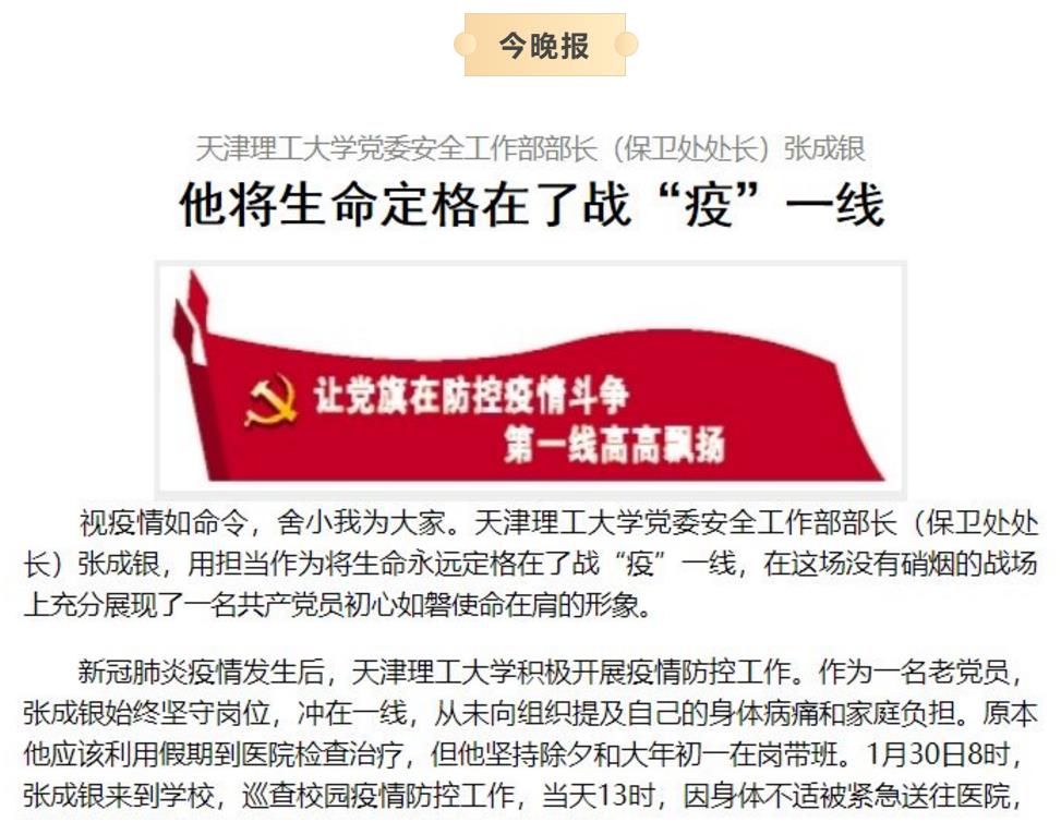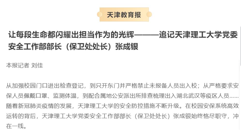 張成銀,男,漢族,河北省人,1964年11月出生,1988年7月參加工作,1999年6月加入中國共產(chǎn)黨,天津理工大學(xué)黨委安全工作部原部長、保衛(wèi)處原處長。2020年1月30日在校園巡查疫情防控工作時,突發(fā)上消化道出血,經(jīng)醫(yī)治無效于1月31日不幸去世,年僅55歲。張成銀同志對黨忠誠、愛崗敬業(yè)、心系師生,面對嚴(yán)峻復(fù)雜的疫情防控形勢,他迅速制定工作方案,對校園實行封閉式管理,從除夕開始就堅持在崗帶班,與校園安保人員一起日夜巡視校園,加強校園進(jìn)出檢查登記和監(jiān)測體溫,配合屬地公安派出所排查梳理出入疫情重點地區(qū)人員,不放過任何一個隱患,確保校園各項防控措施落實到位。