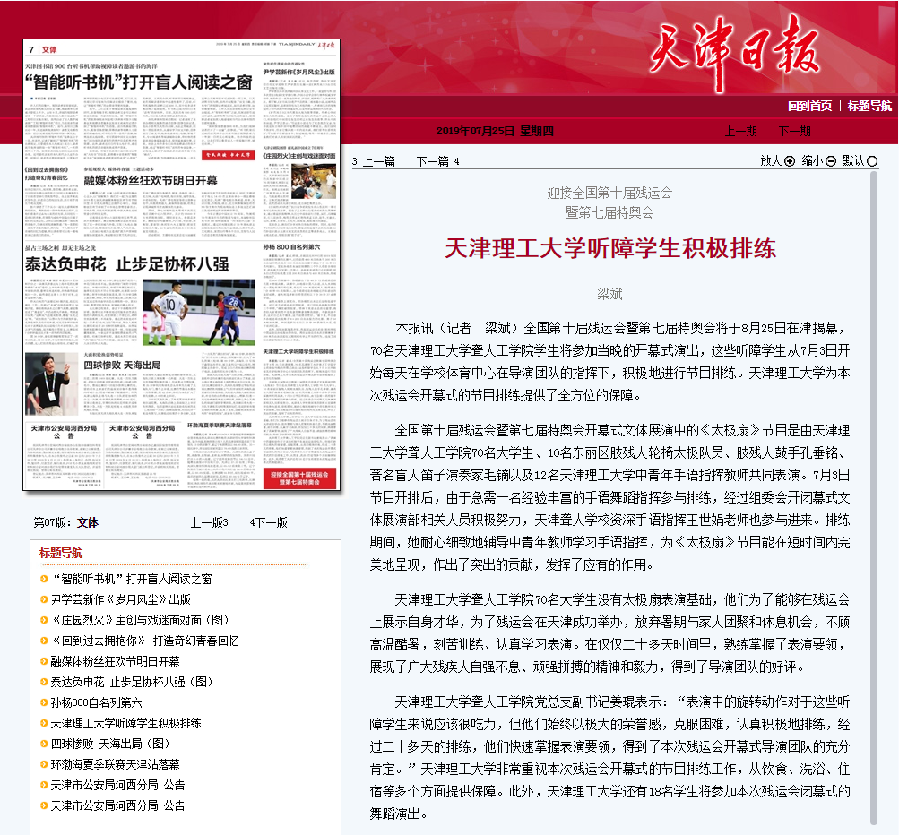 本報訊(記者 梁斌)全國第十屆殘運會暨第七屆特奧會將于8月25日在津揭幕,70名天津理工大學聾人工學院學生將參加當晚的開幕式演出,這些聽障學生從7月3日開始每天在學校體育中心在導演團隊的指揮下,積極地進行節目排練。天津理工大學為本次殘運會開幕式的節目排練提供了全方位的保障。